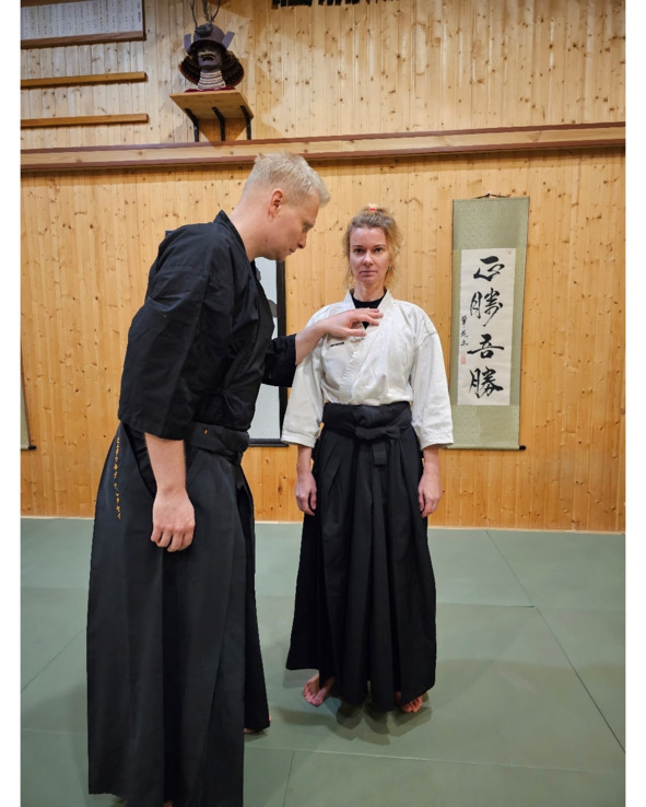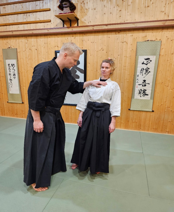 Затем партнёр А закрывает глаза и концентрирует свой разум на образе своего восприятия, сосредоточенном на центре. Несмотря на то что партнёр Б пытается дестабилизировать А, толкая его в разные части тела, А сохранит спокойствие и устойчивость. Партнёру А удастся сохранить целостное восприятие всего пространства (фото 8, 9).