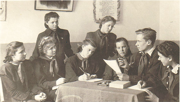 Люба Штерн, стоит слева (1950). В комитете комсомола школы на Сахалине: обучение пионервожатых.