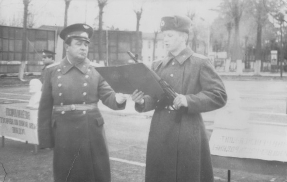 слева – старшина учебной роты гвардии старший прапорщик Батюк В. Н., справа – Михаил Сыч, принятие присяги ноябрь 1984 года.