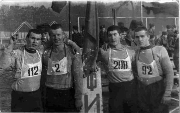 И вот мой первый спортивный праздник. Я в команде с еще тремя ребятами бегу эстафету 4 х 100 метров. Мой первый этап. Старт. Бегу налегке, отрываюсь……. А впрочем, хотелось бы предоставить слово Михаилу Егорову, из моего призыва, с которым я встретился через 30 лет после службы. И вспоминая наши армейские будни, он мне сказал: «Знаешь, я очень хорошо запомнил те соревнования, когда ты бежал 100 метров. Со стороны выглядело как догонялки. Ты бежишь, на первых метрах 30 уже отрываешься от всех на 5—7 метров, замедляешь ход, даёшь себя догнать, а затем опять ускорение и опять такой же отрыв, и вновь замедление и опять рывок». Ту эстафету мы выиграли, и у меня сохранилось фото на память.