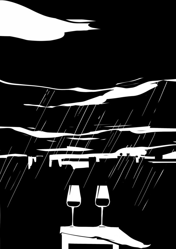 Они стояли перед сомкнутыми шторами, из-за окна доносились раскаты грома, дождь бил о карниз, временами срываясь на оконные стекла. Младшая держала бокалы, старшая аккуратно наполнила оба и вернула полупустую бутылку на стол. Взявшись рукой за бархатную штору, спросила: