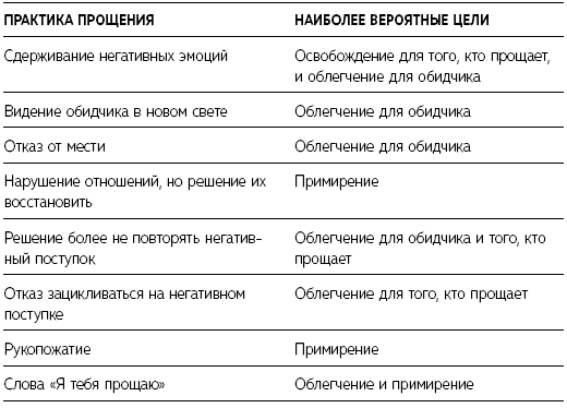 Во-первых, прощение может быть направлено на облегчение – устранение или ослабление боли жертвы и морального гнева на обидчика. Во-вторых, прощение может быть направлено на освобождение – освобождение жертвы от тяжкого груза обиды. Это касается фокуса внимания, действий и установок. Для обидчика это может означать освобождение от чувства долга перед жертвой или от потенциального ощущения собственной вины. В-третьих, прощение может быть направлено на примирение – своего рода воссоединение. Сюда относится и восстановление отношений. Хотя моральных практик огромное множество, все они направлены на эти три цели. А теперь давайте подведем промежуточный итог, чтобы понять, как выглядит прощение (практики и цели) в реальном виде.