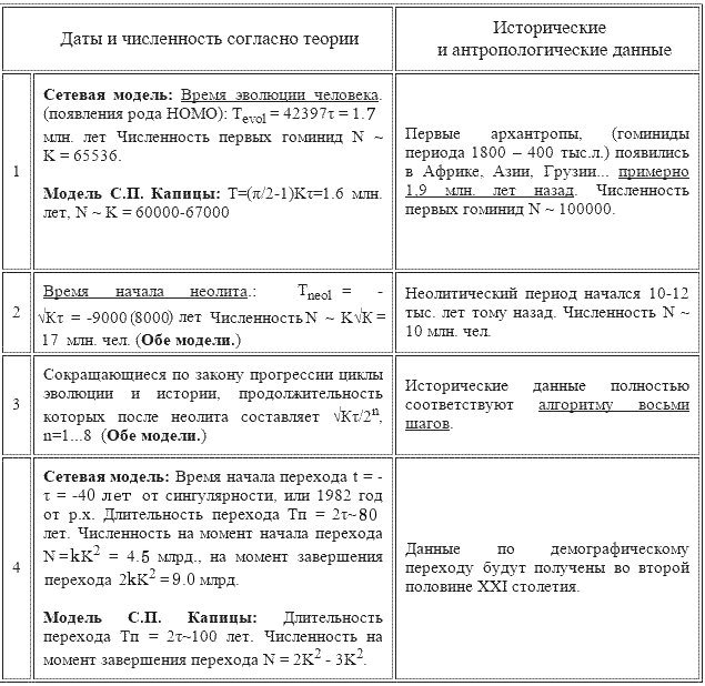 Таблица 1. Самые важные даты эволюции и истории человечества, рассчитанные теоретически с помощью постоянных Капицы τ и К. Приведены также современные научные данные по численности населения Земли в эти моменты времени.