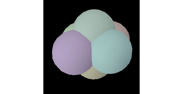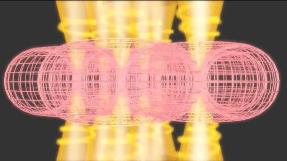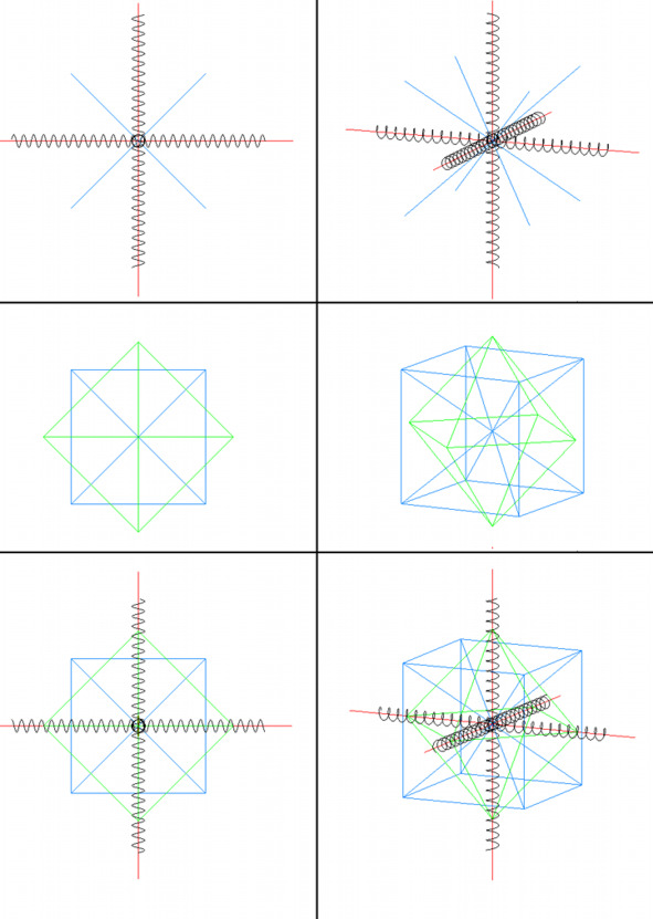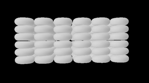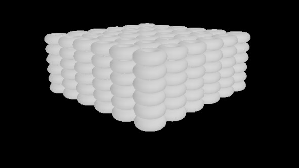 Далее эту матрицу мы поместим в кубический ящик с двигающимися стенками. После чего начнём сдвигать все шесть стенок к центру ящика одновременно, пропорционально, не изменяя общую геометрию куба. В следствие этого мы увидим, что торы (сферы) начнут приобретать форму, близкую к кубической.