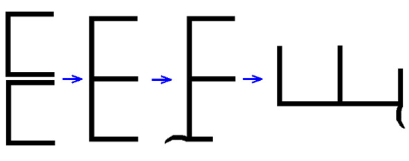 Буковы, написанные чертами и резами, обозначают различные совмещения, стыки силовых линий. Например: