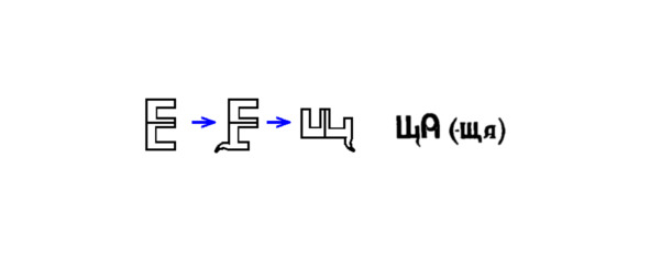 Щ (ща) – это Букова образованная из Е посредством создания в Е ступеньки, с последующим выводом былого Реза Силой Тверди, а былых Чертъ – в новоРезы.