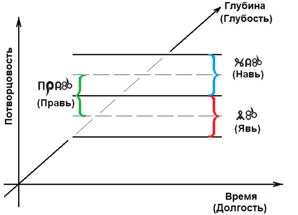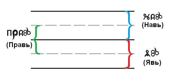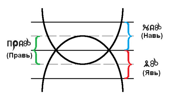 Уровень Прави образуется уже при единении Яви и Нави и обозначен на этой схеме штриховыми линиями.