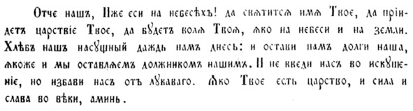 Отче нашъ, Иже еси на небесѣхъ! да святится имя Твое, да пріидетъ царствіе Твое, да будетъ воля Твоя, яко на небеси и на земли. Хлѣбъ нашъ насущный даждь намъ днесь; и остави намъ долги наша, якоже и мы оставляемъ должникомъ нашимъ. И не введи насъ во искушеніе, но избави насъ отъ лукаваго Яко Твое есть царство, и сила и слава во вѣки, аминь.