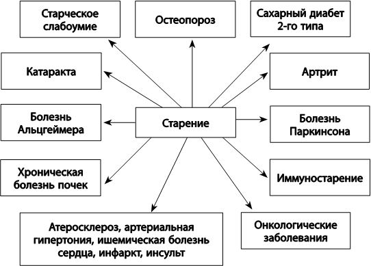 Старение – убийца «номер один» во всем мире. Об этом говорят данные Всемирной организации здравоохранения. Среди 10 ведущих причин смертности в настоящее время лидируют ишемическая болезнь сердца, инсульт и другие цереброваскулярные болезни, рак, сахарный диабет. Смертность от данных причин лавинообразно нарастает с возрастом (рис. 7). Именно старение организма – ухудшение функциональных возможностей различных систем и органов – является основным фактором развития этих и многих других болезней (рис. 8).