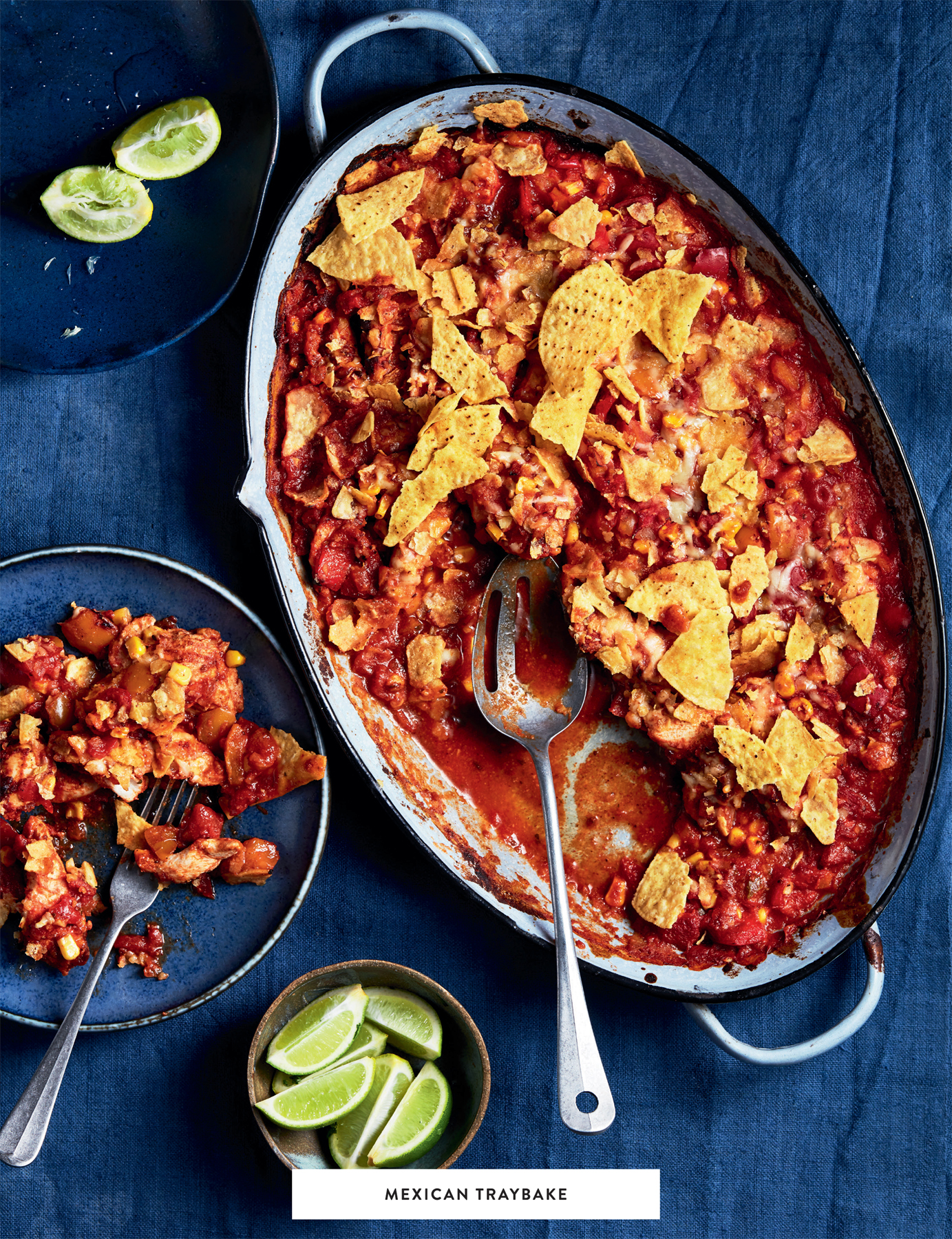 TO COOK: Put the chicken in the base of a large baking dish, scatter over the taco or fajita seasoning and give the mixture a stir to coat the chicken in the spices. Add the salsa, sweetcorn, chopped tomatoes and peppers to the dish and stir again to combine. Scatter over the cheese, followed by the crushed tortilla chips. Bake in an oven preheated to 200°C/400°F/gas mark 6 for 25 minutes, until the chicken is cooked through and the cheese topping is golden and bubbling.