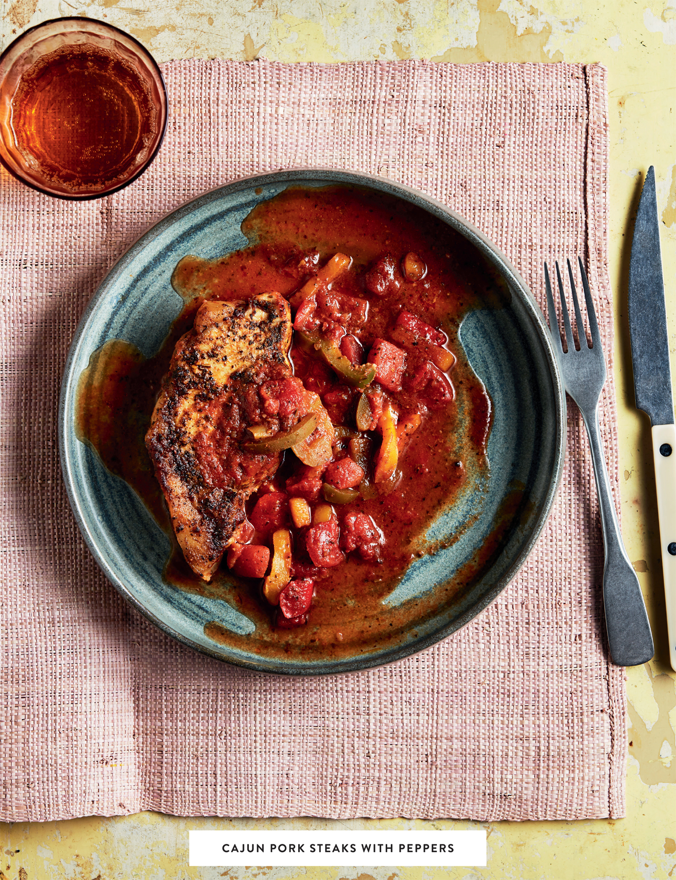 TO COOK: Lay the spice-coated pork steaks in a large baking dish and top with the sliced peppers, then pour over the spiced tomato mixture. Transfer to an oven preheated to 180°C/350°F/gas mark 4 and cook for 25–30 minutes, until the pork is tender. Serve hot.