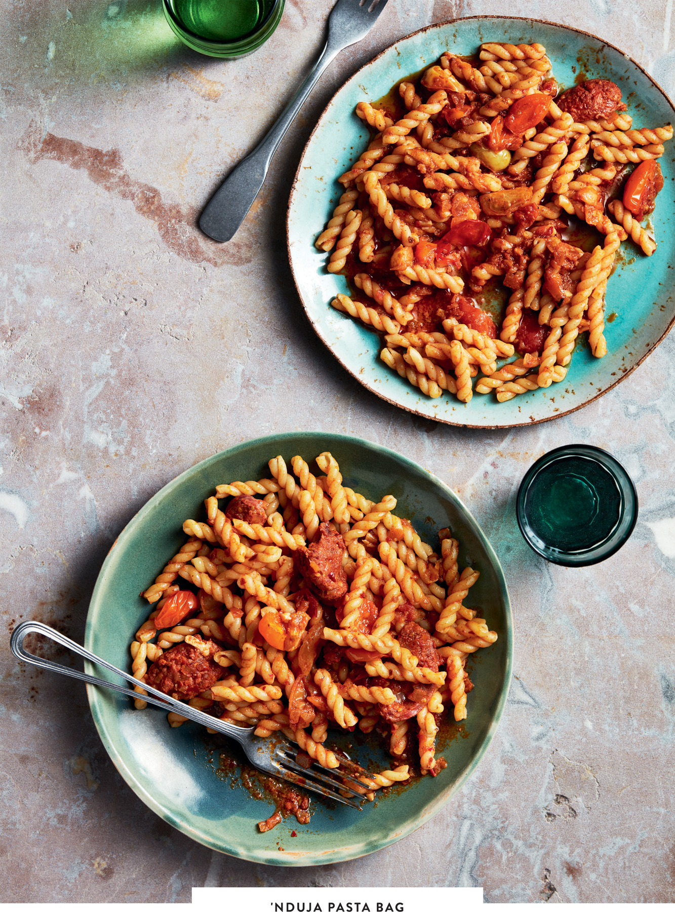 TO COOK: If you are making this to serve now, stir in the smoked sausage and keep warm while you cook the pasta. Stir the cooked pasta through the ‘nduja and sausage mixture, then divide between serving bowls, scatter with Parmesan and serve warm.