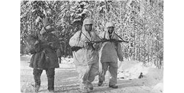 Полей белоснежные скатыБесстрастны движенью войныИ люди в защитных халатахНа белых снегах не видны. И все же мы движемся ночью, В лощинах встречая рассвет, А Фриц обнаружить нас хочет И светит шипучкой ракет.Он жжет на окраинах хатыИ страх не сумев превозмочь,Нервозным огнем автоматовПугает безмолвную ночь. Пугает… Но пришлому Фрицу Вдвойне наши ночи страшны И сам он смертельно боится Халатов с другой стороны.