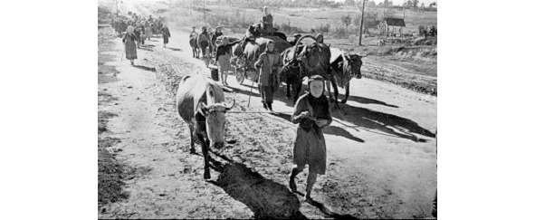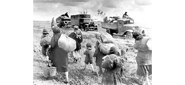 Под самолетный смертоносный гудДорогами, ведущими к востоку,Как от чумы свирепой и жестокойУходят жители. Бегут…Из Вильно, Каунаса, Белостока… Июньский воздух пылен и горяч. Шрапнель в нем виснет темными клочками. Они бегут – с корзинками, с узлами… И слезы женские, и детский плачь С автомобильными слились гудками.А им навстречу, яростны и злы,Не испугавшись вражьего нахрапа,Несутся наши летчики-орлы.И гусеничным ходом тяжелыУпрямо танки движутся на запад. Войска идут, войска идут, идут… Их натиск грозен, их порыв неистов. И верят беженцы – они дойдут. И верят беженцы – они сметут С лица земли чуму фашистов!
