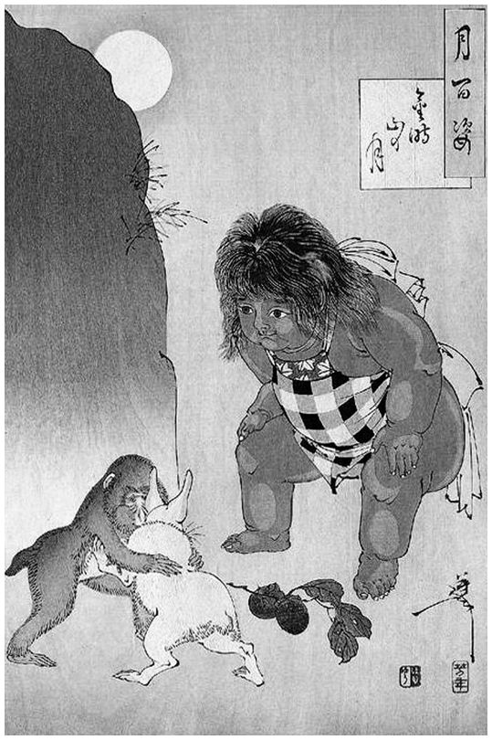 Цукиока Ёситоси. Кинтаро наблюдает за борьбой обезьянки и зайца. XIX в.