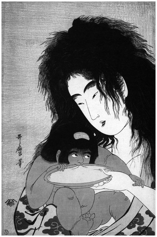 Интересная история связана и с его матерью Яэгири. Этого персонажа часто отождествляют с чудовищем-ёкаем[9] по имени Ямауба. Примерно имя Ямауба можно перевести как «горная ведьма», этот персонаж отдаленно напоминает нашу отечественную Бабу-ягу. В легендах Ямауба играет разные роли: она может быть как злой людоедкой, способной вызвать ураган и град, так и покровительницей положительных героев. В одном из вариантов легенды о Кинтаро его мать Яэгири рано умерла, и мальчика воспитала в лесной хижине именно Ямауба. А в другом варианте Яэгири, прожив в лесу некоторое время, сама перевоплощается в ведьму-Ямаубу и после этого воспитывает мальчика.