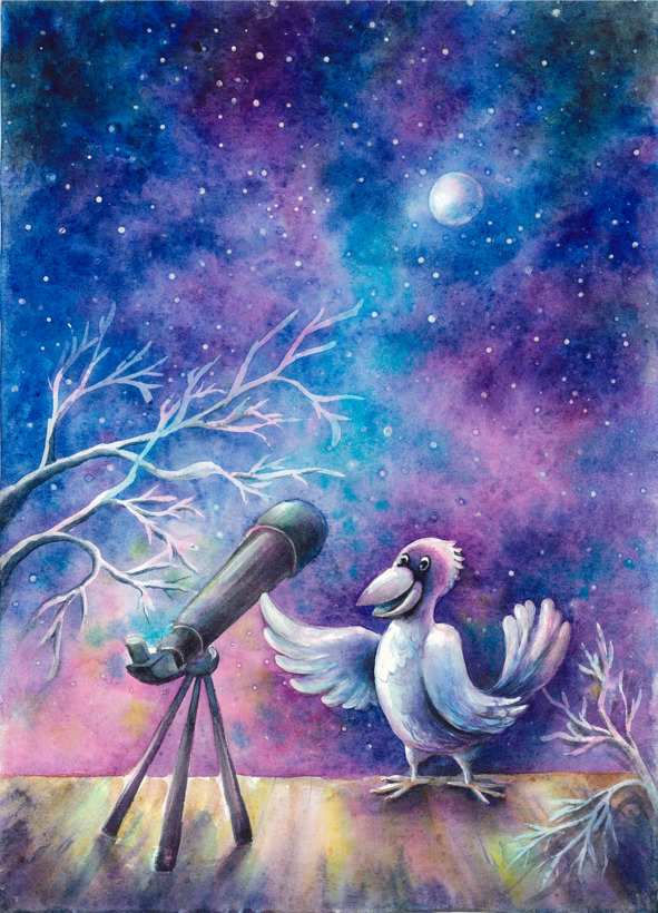 Воронёнок рос, и больше всего на свете ему нравилось сидеть в гнезде и смотреть ночью на звёзды. Иногда он заглядывал в гости к тетушке Сове и рылся в ее огромной библиотеке.