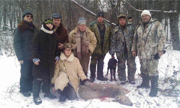 Among the winter, Vladlen and I went on a round-up hunt for a wild boar. Sunny windless, frosty, weather gathered about fifteen people. A local huntsman, a young, competent man in a white sheepskin coat and felt boots showed us the prey places. Each time, with the move to new land, the command of the beaters and shooters, changed places, except for me, and my dog. We did not leave our “unprofitable” place in the corral. We walked and enjoyed the breath of nature. Among the pines and firs, through the thicket in the ranks drove the beast on a shot. But it was all in vain. Echoed through the forest: – Up… up… up.