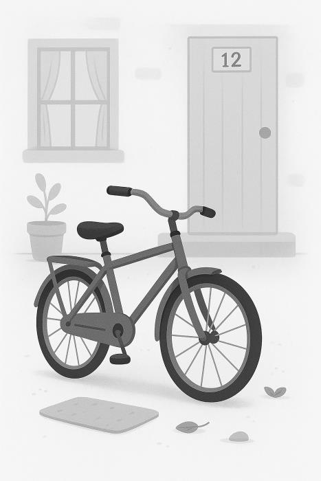 He stops and looks. There is a red bicycle near house number 12. The bicycle is old but nice. David likes this bicycle!