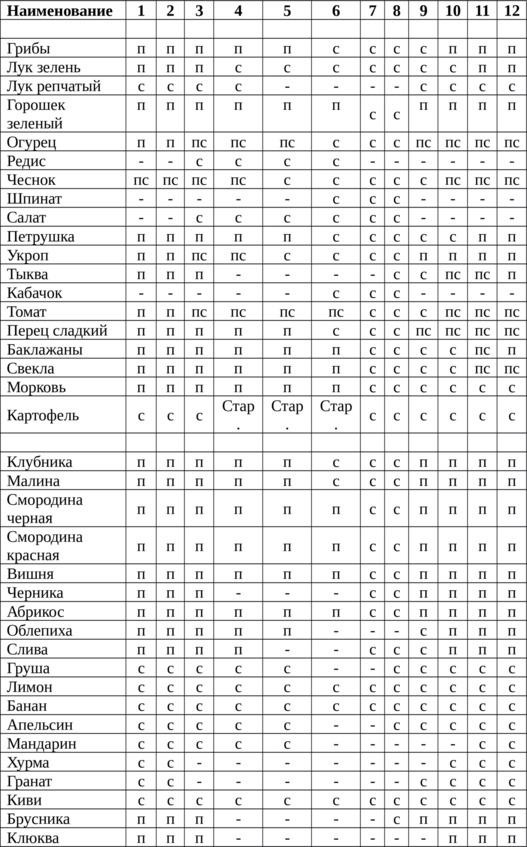 Фрукты и овощи в течение года можно разделить на три вида: 1. Сезонные в употреблении и планируемые к заготовлению на зиму. 2. сезонные без заготовок. 3. без заготовок круглый год в употреблении. На файле «Продукты питания», эти две категории имеют об этом отметки.