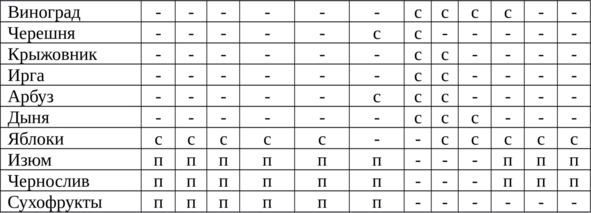 Согласно этой таблице, распределяются ваши любимые рецепты по трем кварталам сезонности блюд, с ноября по февраль, с марта по июль, с июля по ноябрь. В каждом месяце видно, какими продуктами вы пользуетесь по своей возможности, свежими, или заготовками на зиму.
