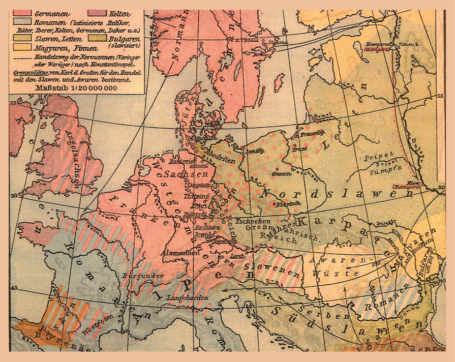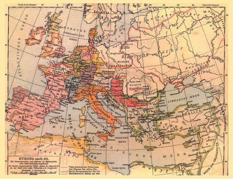 It was the time when a number of independent Germanic tribes, which had settled in Europe between the Danube in the South and the North- and Baltic- Seas, and between the Rhine in the West and the Vistula (=Weichsel) in the East. It was the time when the transition began from migratory hunting and herding to agriculture and village life.
