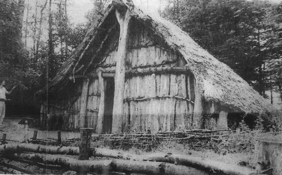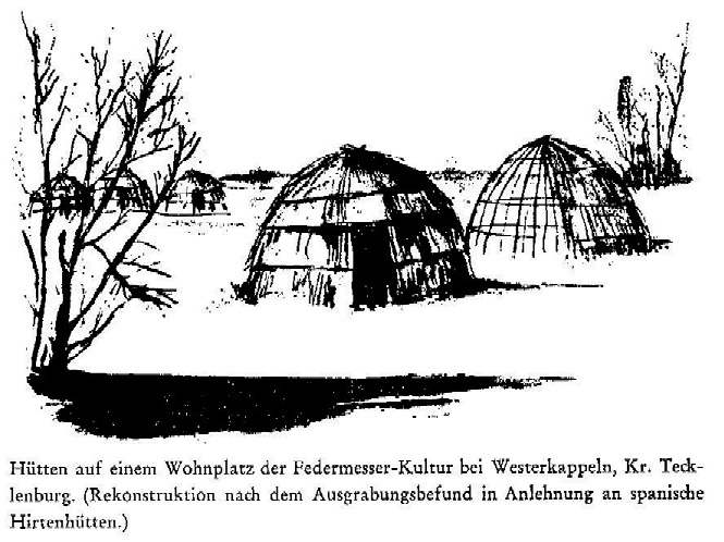 The sketch (fig.:#3), shows a likely reconstruction of these huts, reflecting details of dwellings from the Feather-Knife (Pen-Knife) period near Westerkappeln. (About 9000 B.C. – 8000 B.C.)