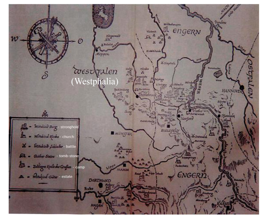 Around 450 A.D. Count Hengist from the same dynasty together with Prince Horsa founded a Saxonian kingdom in England and called themselves kings. At that time the English county of Herfordia got her name from a borough of Herford not far from Enger. Count Hengist is also the reason for many English lord-titles, like Elting, Lindhorst, Bathorst, Herbert and others, all going back to actual Westphalian farm places.