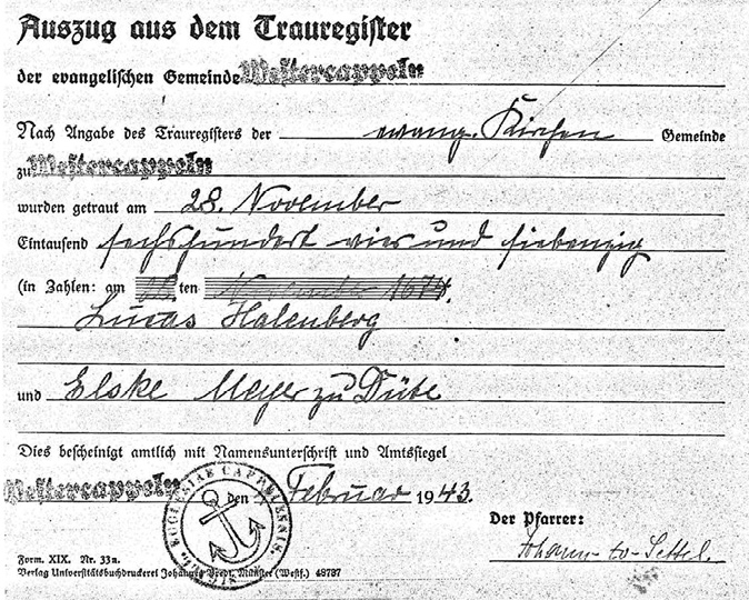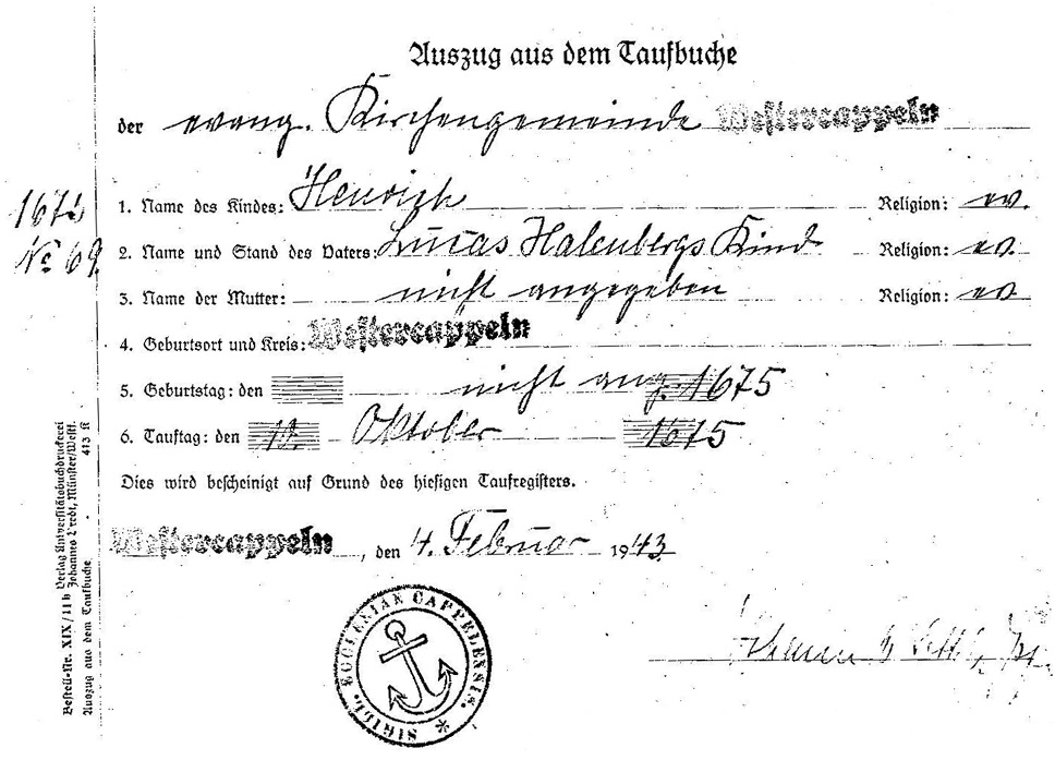 Old church papers give proof of the marriage between Lucas Halenberg and Elske Meyer zu Düte, and indicate that their wedding took place on November 28, 1674 at the Protestant Church (Lutheran-Reformist) in the parish of Westerkappeln. (fig.:#17 below)