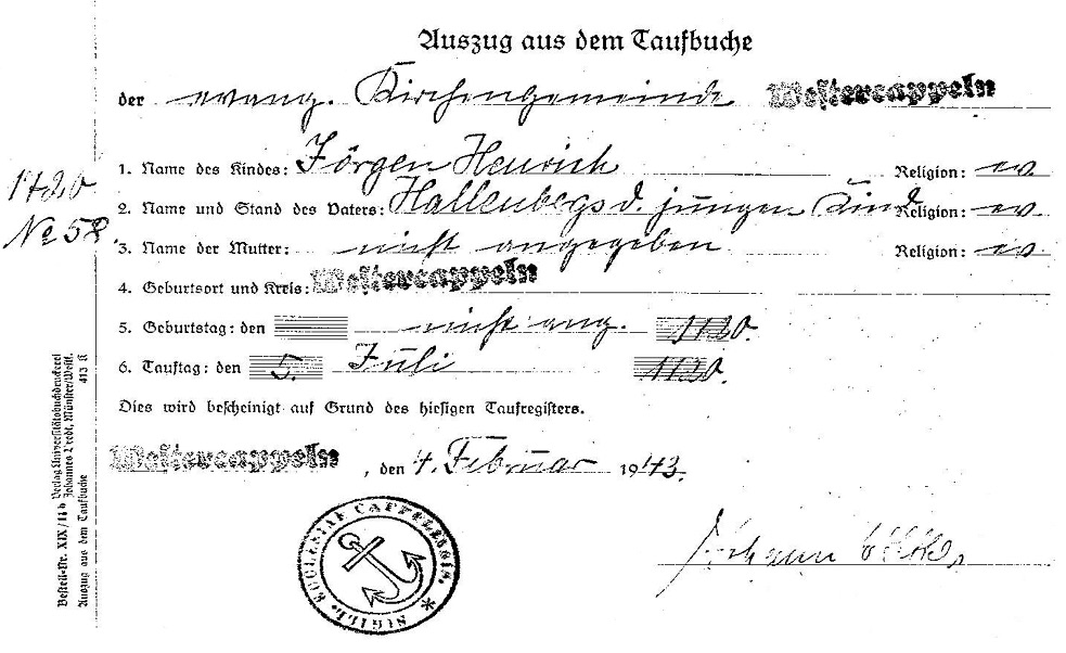 Their Son Jörgen-Henrich also referred to as Hallenbergs de Junge Child, born in July of 1720, married Maria-Gertrud Meier. (See his birth certificate, fig.:#19 below)