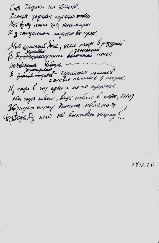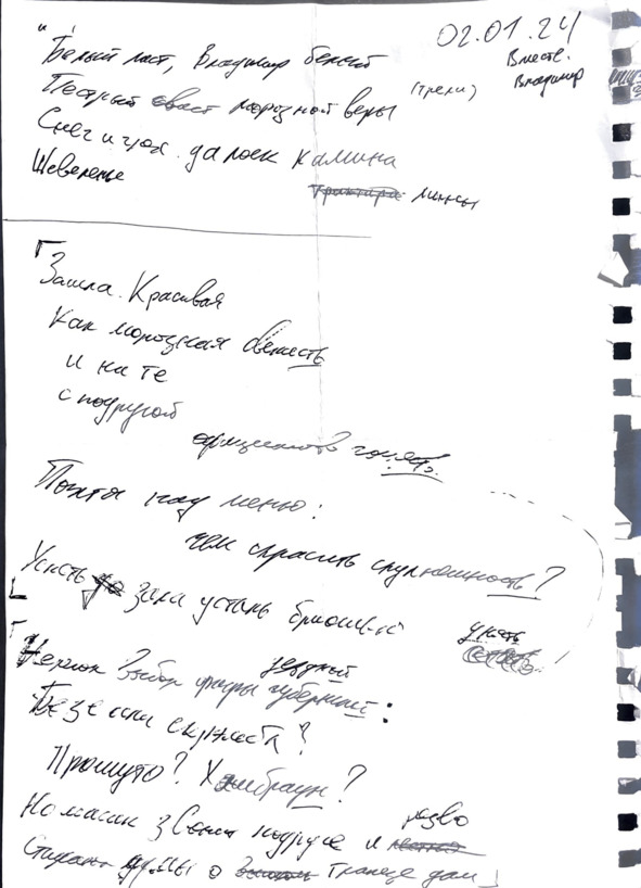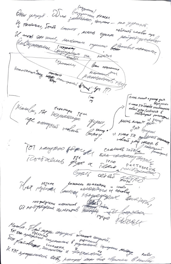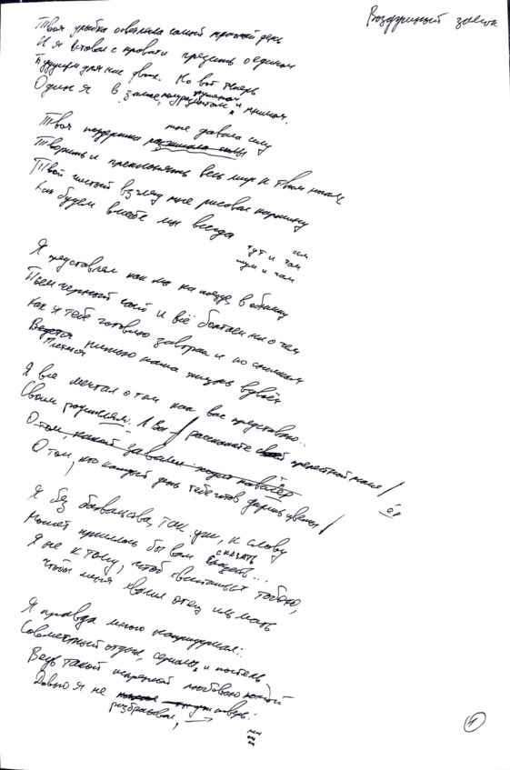 Большинство стихов – я написал от руки. Я пишу сплошным текстом, как прозу, и часто сам не понимаю что и как рифмую. У меня ужасный почерк, и я сам не всегда его различаю, поэтому, перечитывая, надписываю сверху печатными буквами, что значат те или иные слова.