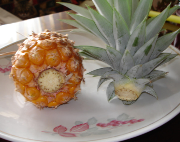 Важно, чтобы внутри короны находилась точка роста в виде маленьких острых молодых зеленых листочков. А нередко привозят такие ананасы, словно у них выщипали точку роста.