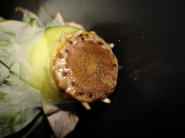 Срезают корону остро заточенным ножом. Важно, чтобы срез получился ровным без задиров. Верхушку соплодия срезом вверх оставляю где-нибудь в темном месте при комнатной температуре для просушки, чтобы срез затянулся пленкой.