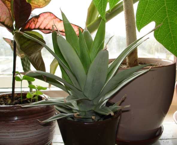 При выращивании ананаса необходимо чередовать обильный полив отстоявшейся водой с кратковременным подсушиванием почвы. Зимой, так как света мало и ананас растет медленно, интервал между поливами увеличиваю. Поливаю под куст, а не в розетку листьев. Весной и летом подкармливаю ананас настоем коровяка: заливаю коровяк кипятком (в пропорции 1:30) и выдерживаю пару недель в закрытой банке. По мере отрастания новых листьев слегка подрезаю их острые концы, чтобы случайно не пораниться.