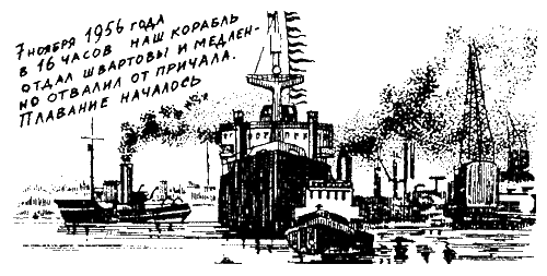 Так или иначе, в день Октябрьской революции, 7 ноября 1956 г. в 16 ч. наш корабль отдал швартовы и медленно отвалил от причала. Плавание началось.
