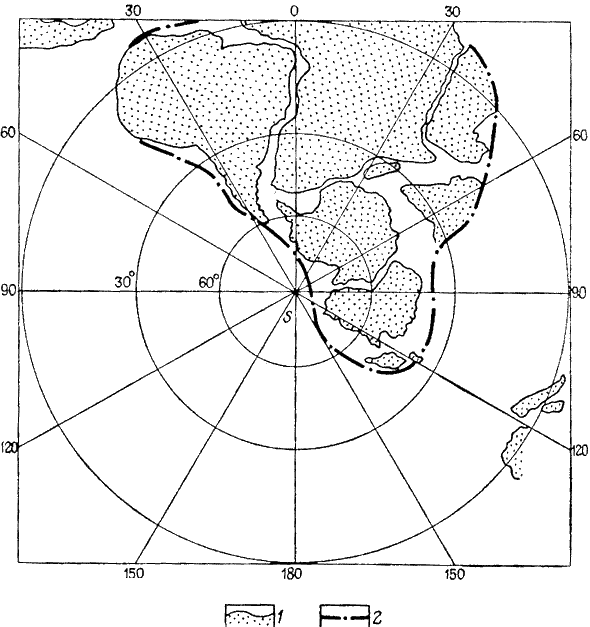 Рис. 1. Реконструкция Гондваны (по Л. П. Зонненшайну и А. М. Городницкому