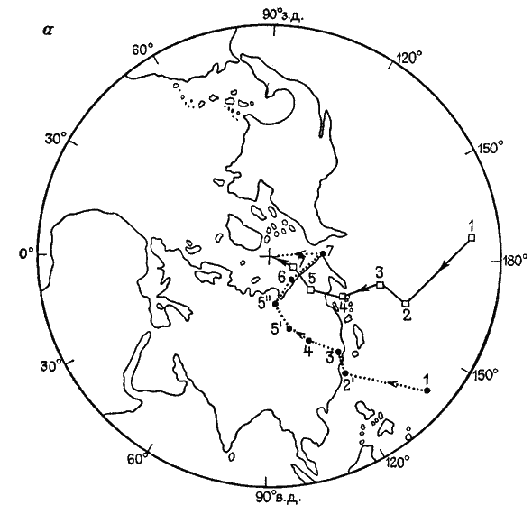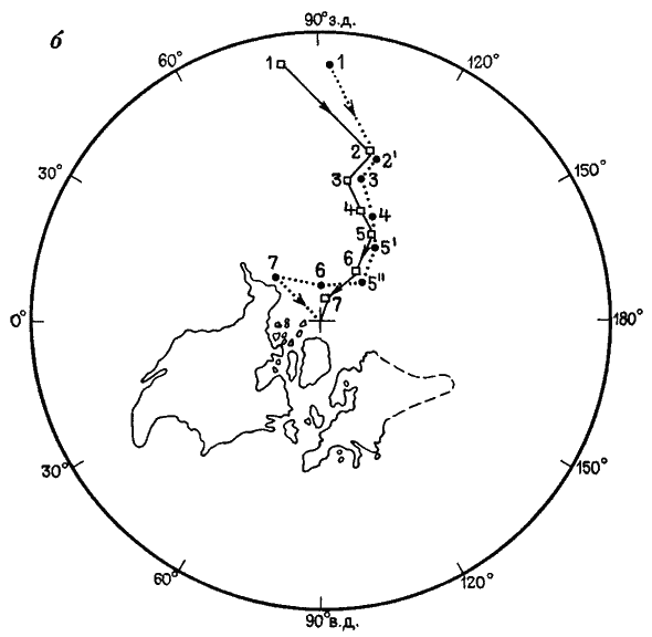 а – относительно современного положения материков; б – относительно материков, соединенных в Лавразии; 1 – кембрий; 2 – силур; 2 – силур – девон; 3 – поздний карбон; 4 – Пермь; 5 —триас; 5 – ранний триас; 5" – поздний триас; 6 – юра; 7 – мел