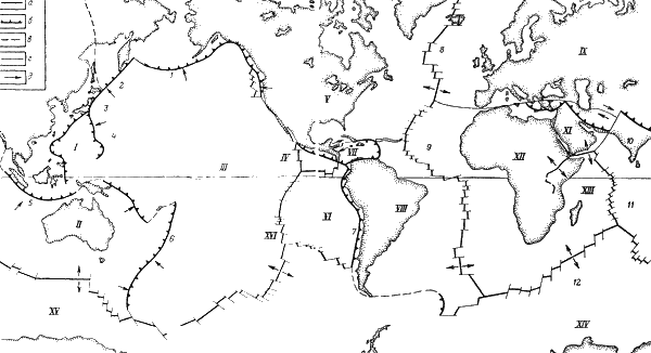 Плиты: I – Филиппинская, II – Индийско-Австралийская, III – Тихоокеанская, IV – Кокос, V – Северо-Американская; VI – Наска, VII – Карибская, VIII – Южно-Американская, IX – Евразийская, X – Анатолийская, XI – Аравийская, XII – Африканская, XIII – Сомалийская, XVI – Антарктическая; поднятия: XV – Австрало-Антарктическое, XVI – Тихоокеанское; желоба: / – Алеутский, 2– Курило-Камчатский, 3 – Японский, 4 – Марианский, 5 – Яванский, 6 – Тонго, 7 – Перуано-Чилийский; хребты: 8 – Рейкьянес, 9 – Срединно-Атлантический, 10 – Аравийско-Индийский (Карлсберг), // – Центрально-Индийский, 12 – Африкано-Антарктический и Западно-Индийский