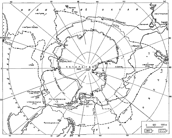 Через 50 лет, в период с 5 июля 1819 г. по 5 августа 1821 г., русские мореходы под командованием Ф. Беллинсгаузена на кораблях «Восток» и «Мирный» (капитан М. П. Лазарев) совершили новое кругосветное плавание в тех же широтах, где прошли корабли Кука. Порой их маршрут проходил южнее маршрута Кука, порой – севернее. Особенно близко к Антарктиде им удалось подойти между 60 и 100° з. д. в районе Антарктического полуострова, где они открыли остров, названный именем Петра I, и Землю, названную именем Александра I. Здесь они достигли 68° 50 ю. ш. (рис. 5). Море, омывающее эту область, названо морем Беллинсгаузена. Также близко к берегам Антарктиды они подошли у 2° 10 з. д., где достигли 69°25 ю. ш., подойдя примерно на 50 км к берегу Принцессы Марты. Им также удалось подойти близко к берегу у 15° в. д. Область океана между этими долготами названа морем Лазарева. Наконец, четвертая близкая к континенту точка достигнута ими на 39° в. д. в районе Земли Эндерби, где они находились в 100 км от берега.