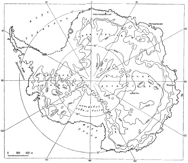 В пределах Восточной Антарктиды можно выделить три области, где мощность ледникового покрова превышает 3000 м, а кое-где достигает 4000 м. Это ледниковое плато находится южнее гор Земли Королевы Мод, охватывает Западную равнину и плато Советское, на котором расположен Полюс Недоступности. Второй областью является сектор от 110 до 140° в. д. и от 80 до 70° ю. ш. Здесь абсолютные высоты континента достигают 4000 м при почти такой же толщине льда. Горные области, окружающие это плато, препятствуют стоку льда к океану, и поэтому здесь происходит систематическое его накопление. Карта рельефа Антарктиды по льду дана на рис. 11.