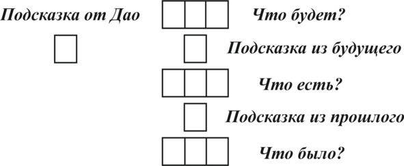 Теперь вытягиваем карты. Здесь неважно: настоящую ситуацию рассмотреть первой или прошлое с будущим. Итак, вытягиваем три карты, которые покажут существующее положение, допустим, настоящего (можно по одной вытаскивать, а можно сразу три). Центральная карта говорит о нас самих, если гадаем на себя, либо о вопрошающем человеке (предмете или вещи), а две по бокам показывают ближайшее окружение. Далее снизу кладем три карты прошлого. Потом вытаскиваем так же три карты будущего и в последнюю очередь достаем карты «Подсказка из прошлого», «Подсказка из будущего» и «Подсказка от Дао (или от Вана)». Можно назвать их «подсказка» или «совет». При работе с большой колодой (64 карты) делаем расклад, как в картах Таро, т. е. не нужно их вновь помещать в колоду. «Подсказки» можно также класть не в последнюю очередь, а после каждой ситуации – прошлого, настоящего и будущего.