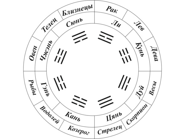 Знаки расположены по часовой стрелке, начиная с Овна, чтобы было удобнее рассматривать их с триграммами. Получается, что каждая из триграмм (возьмем для примера Чжэнь) захватывает один знак целиком (Овен) и половину следующего (Телец). Она принимает на себя все характеристики основного знака и некоторые – другого.
