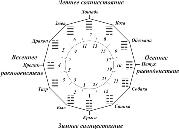 Здесь изображены гексаграммы, которые соотносятся с определенными животными из китайского календаря. Легко увидеть, что слева идет увеличение силы Ян – снизу в каждой фигуре. И далее наоборот – увеличение противоположной энергии. Внутри каждого угла двенадцатиугольника расположена гексаграмма с определенным названием. По окружности с внешней стороны – китайские «двухчасия», а внутри – соответствия нашим часам.