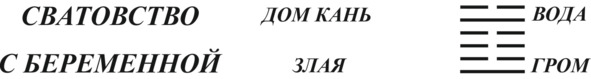 Я уже говорил, что в гадании монетами трудно получить гексаграмму со всеми изменяющимися линиями, равно как и фигуру без изменяющихся линий. Но все равно такие случаи происходят, и вот вам пример от моей жены. Ей нужно было определиться с трудовыми отношениями с пятью мужчинами. Я присутствовал при гадании. Для первого выпало: Гром – Гром; для второго: Земля – Земля; для третьего: Небо – Небо; четвертый: Гром – Гром и пятый: она – Гром, ее компаньон – Гора.