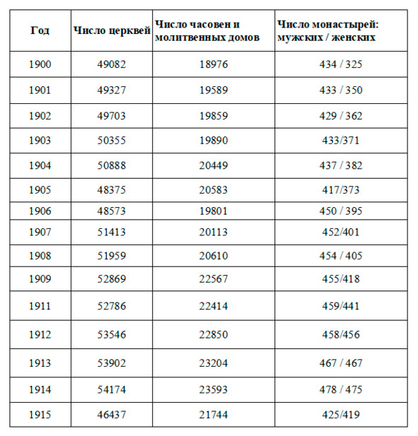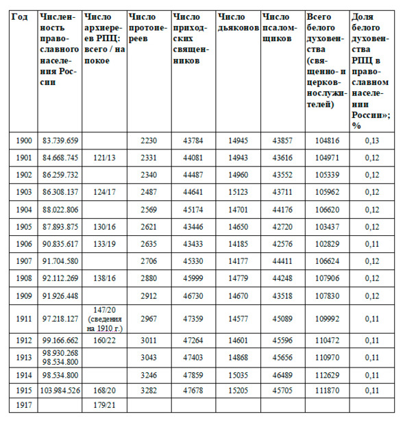 РПЦ в начале XX века среди конфессий Российской империи, согласно действовавшему законодательству, занимала «первенствующее и господствующее» положение107, её священнослужители являлись духовными пастырями около 70% населения страны. Всего в РПЦ было 68 епархий, которые к 1917 году включали в себя 94 викариатства. В 1914 году в России насчитывалось свыше 54 тысяч (без учёта военных) церквей, более 23,5 тысяч часовен и молитвенных домов; общее число духовенства превышало 112 тысяч человек; монастырей (не считая скитов) было 1025, в них проживало около 30 тысяч монашествующих108. Православная церковь имела 4 высших учебных заведения (духовных академии), располагала широкой сетью средних и начальных духовных школ: 57 семинариями и 187 духовными училищами, находившихся практически во всех епархиях. В 42 тысячах церковно-приходских школах (что составляло треть всех школ страны) обучались сотни тысяч православных, Русская православная церковь служила главным идейным союзником государства109. В целом в начале ХХ века в Русской православной церкви происходил неуклонный рост как числа православных христиан за счёт роста населения Российской империи, так и численности всех слоёв духовенства.