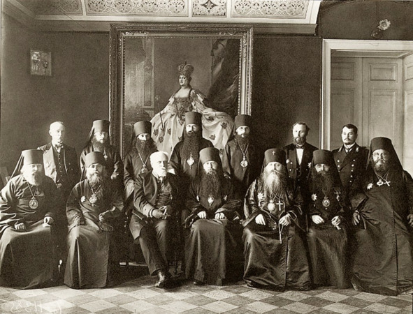 Группа членов Святейшего Синода. Участники Чрезвычайного собрания Святейшего Синода. 26 июля 1911 года в главном зале митрополичьего дома Александро-Невской лавры. В нижнем ряду: епископ Ямбургский Георгий (Ярошевский), епископ Туркестанский и Ташкентский Димитрий (Абашидзе), обер-прокурор Святейшего Синода В. К. Саблер, архиепископ Финляндский и Выборгский Сергий (Страгородский), архиепископ Волынский Антоний (Храповицкий), епископ Могилёвский и Мстиславский Стефан (Архангельский), епископ Чистопольский Алексий (Дородницын). В верхнем ряду: неизв., неизв., епископ Тихвинский Андроник (Никольский), епископ Иннокентий (Ястребов), епископ Волоколамский Феодор (Поздеевский), неизв., неизв.188