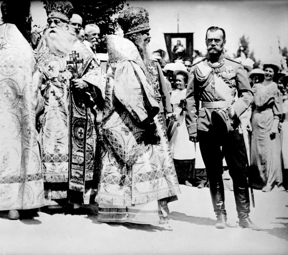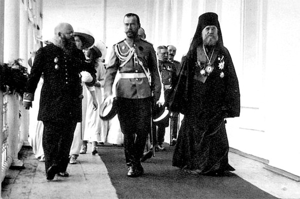 Император Николай II в сопровождении Архиепископа Тихона, будущего Патриарха Московского и всея России (1917—1925) в Спасском монастыре, 1913 г.193