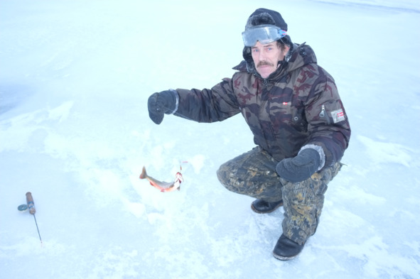 Через двадцать минут мы уже пробурили первые лунки, лед на озере был около 20 см. Я опустил блесну на дно, чуть приподнял, тихонько поигрывая, и тут же ощутил резкий удар. Сделав стремительную подсечку, не давая слабины перебирая леску, быстро вытащил сильную рыбину на лед. Палия была очень красивой, от обыкновенного гольца ее отличает более красочный наряд – буровато-зеленоватая чешуя с золотистым отливом, солнечно-золотыми крапами и просто пылающим брюшком! Еще несколько удачных подсечек и на льду появились гольцы другой раскраски.
