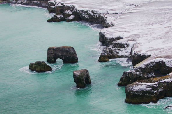 Остров Вайгач встретил нас неприветливо, дул южный ветер и его порывы достигали 20 м/с. И, хотя температура воздуха была чуть ниже ноля градусов, было не очень комфортно. Снег только слегка припорошил красивые скалы, а море с разноцветными камешками, лежащими в зеленоватой морской воде, было неспокойно, и волны, разбиваясь о берег, распадались на мириады брызг. Вообще вид, конечно, поражает своим грозным величием.