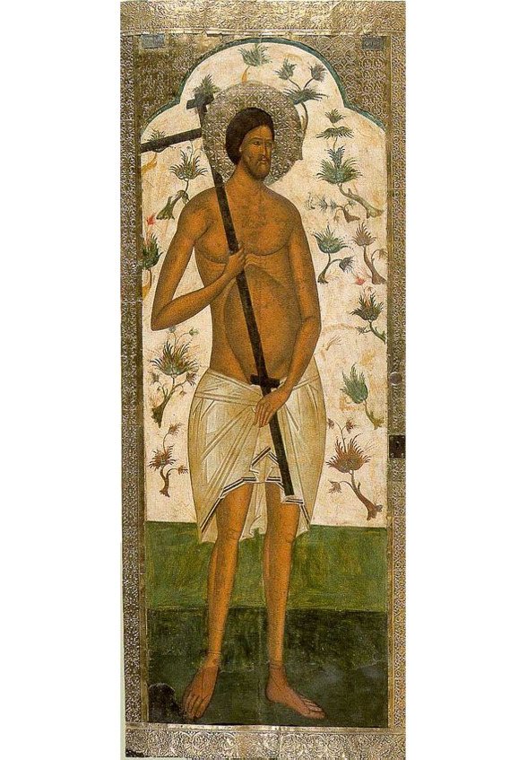 Благоразумный разбойник на дьяконской двери иконостаса. Иконописец Московского кремля никогда не видел реального разбойника. Поэтому он писал то, что считал нужным.